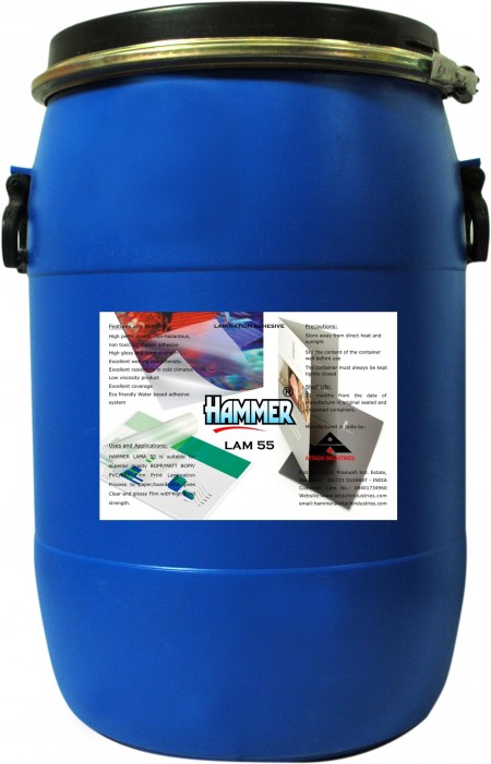 HAMMER LAM 55 is a Polyvinyl Copolymer acrylic dispersion with enriching additives, which has been developed especially for BOPP film Print Lamination. HAMMER LAM 55 is a Normal Viscosity product and has the property of good an uniform spreading. It can be applied at room temperature and sets without application of heat or use of a hardener and has good machinability.